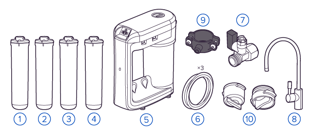 О замене картриджей напомнит звуковая и цветовая индикация ресурса каждого модуля. Встроенный насос обеспечивает стабильную работу даже при низком давлении от 0,9 атм.